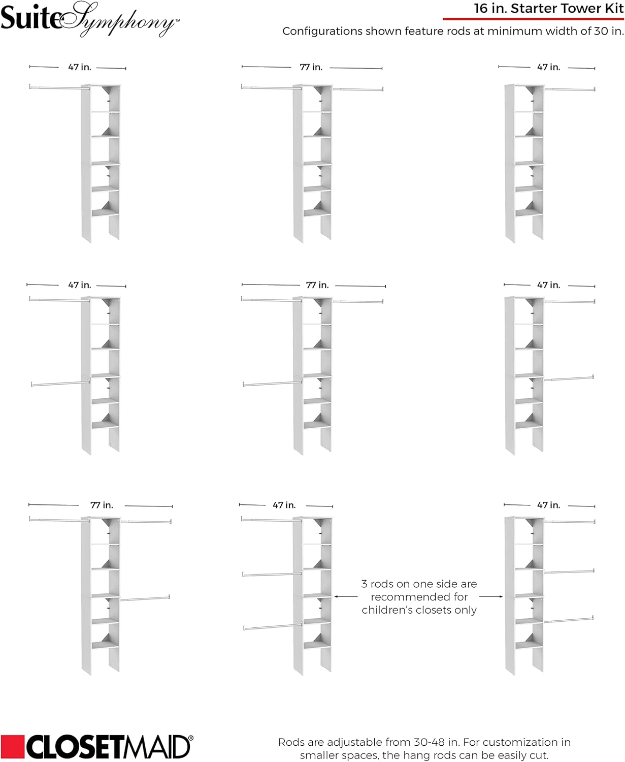Upgrade your closet with the ClosetMaid SuiteSymphony Wood Closet Organizer Starter Kit, a versatile and stylish solution for spaces 4 to 9 feet wide. Featuring a sturdy tower, three expandable rods, and five interior shelves (including two adjustable ones), this organizer provides customizable storage for clothing, shoes, and accessories. Compatible with add-ons for even more organization, the Pure White finish adds a modern touch to any room. All installation hardware is included, making setup simple and hassle-free. Perfect for anyone looking to maximize space and streamline their wardrobe with confidence in the ClosetMaid brand.