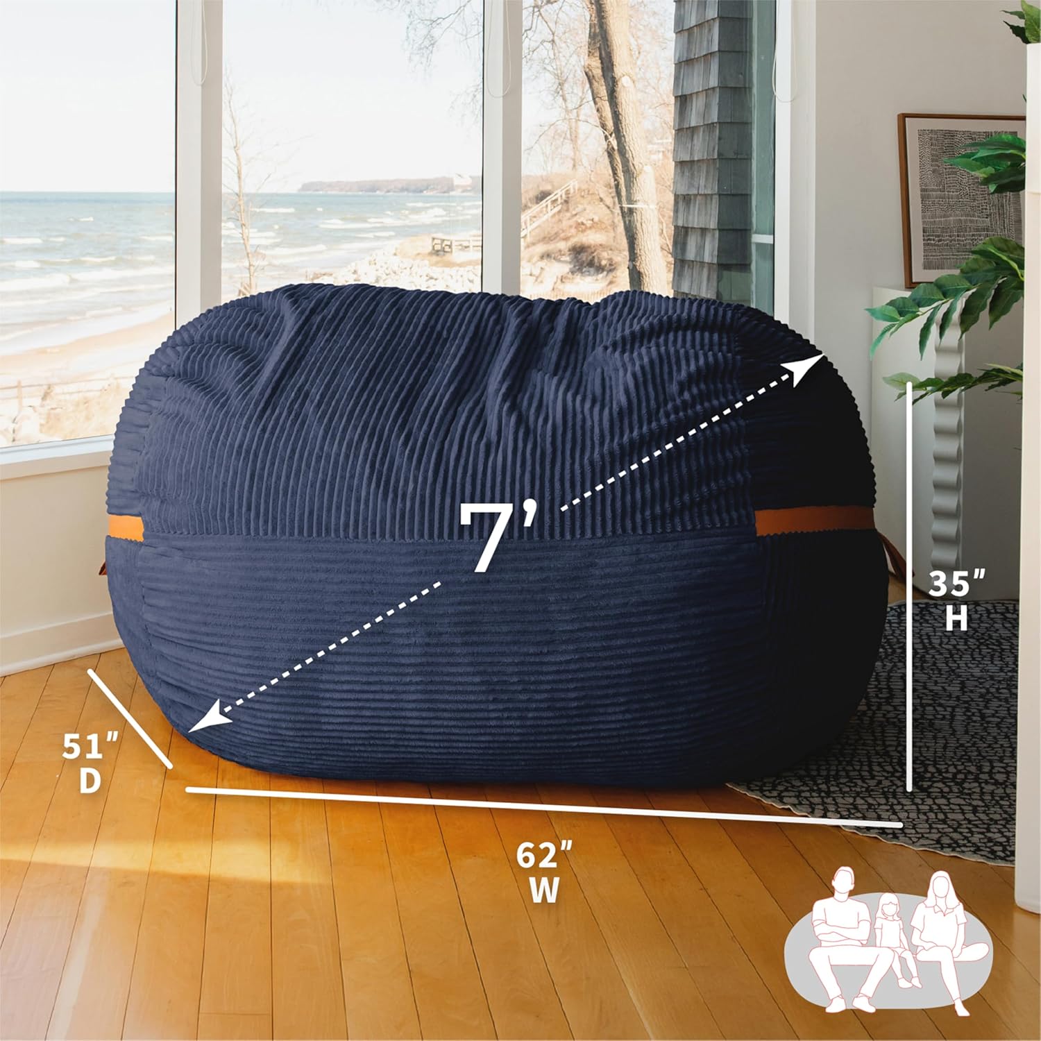 Measuring 7 feet across, this giant bean bag fits kids, teens, and adults—sometimes even two at a time. Big Joe packs it with their proprietary shredded foam filling so you can sink in without losing support. The Midnight Blue Corded Plush cover exudes a soft, cozy vibe that’s instantly inviting while supporting modern decor.