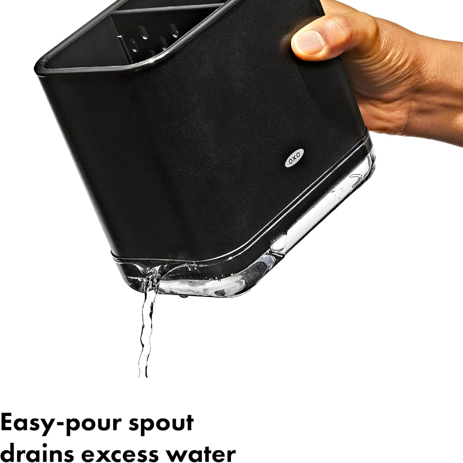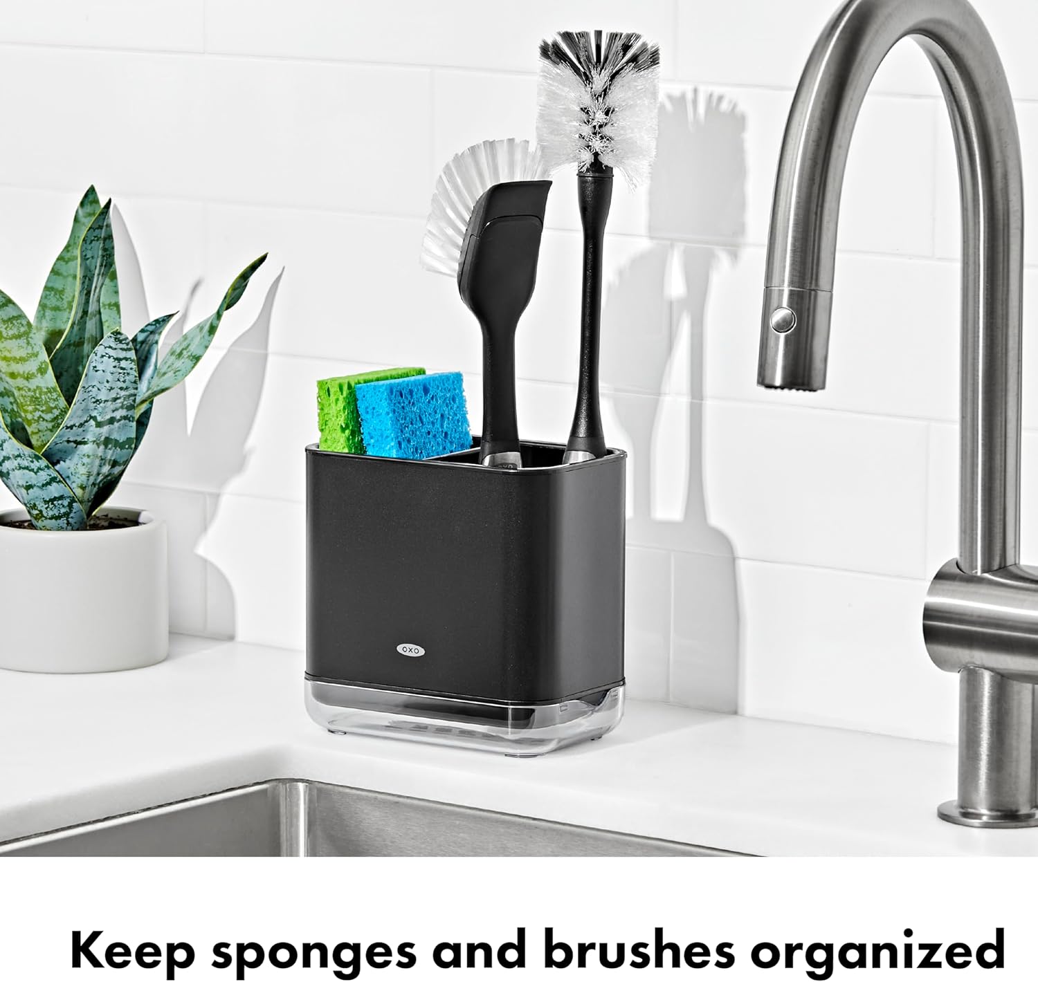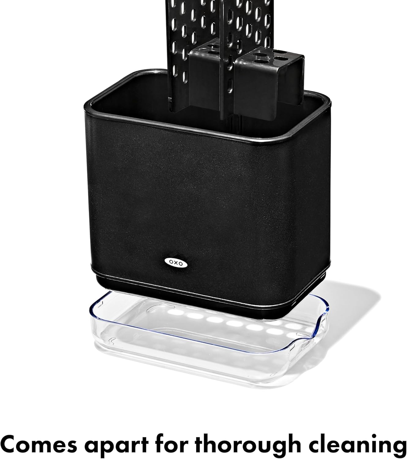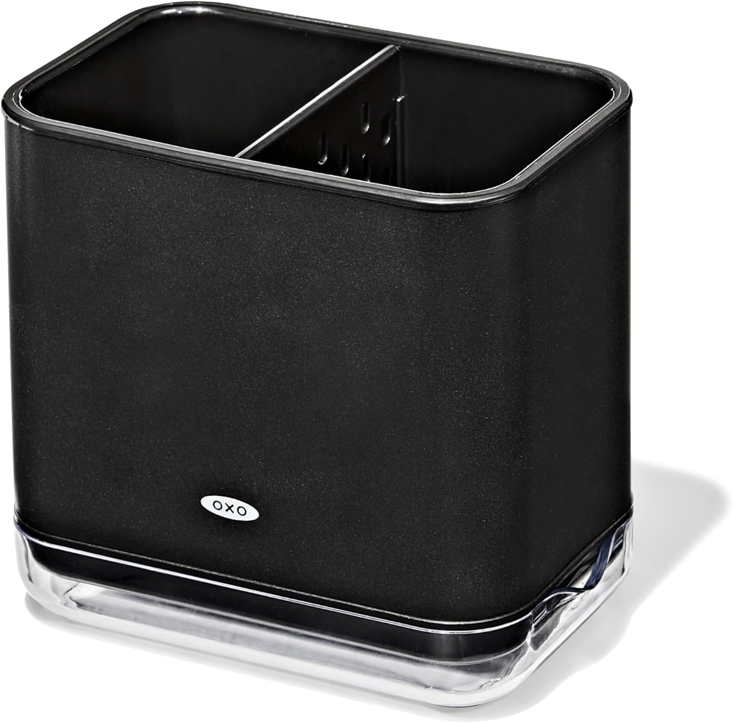 Keep your kitchen organized with the OXO Good Grips Stainless Steel Sink Caddy in sleek black. This durable caddy features a ventilated divider that separates and dries sponges and brushes quickly, while a convenient drip tray channels excess water for effortless cleanup. Designed by OXO, it's a stylish and practical solution that fits seamlessly into any modern kitchen, making it an essential upgrade for your sink area.