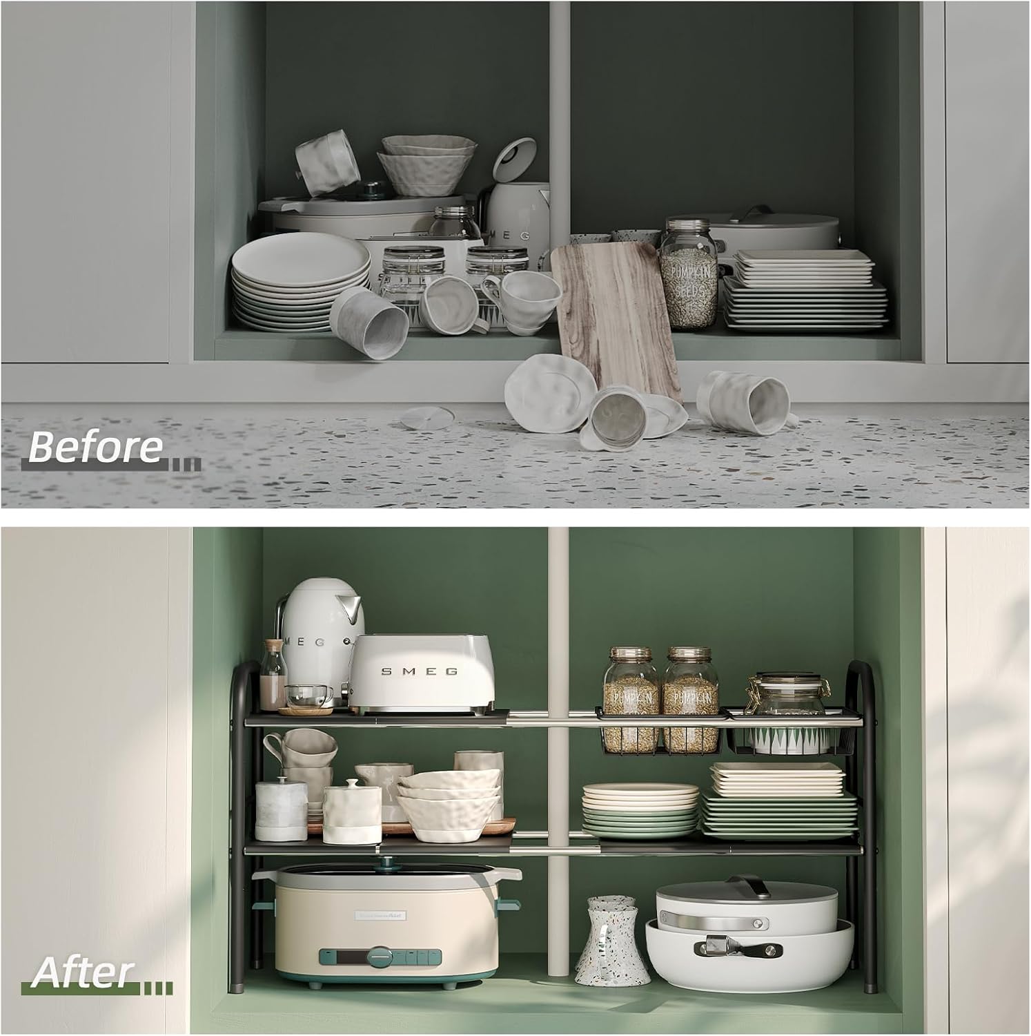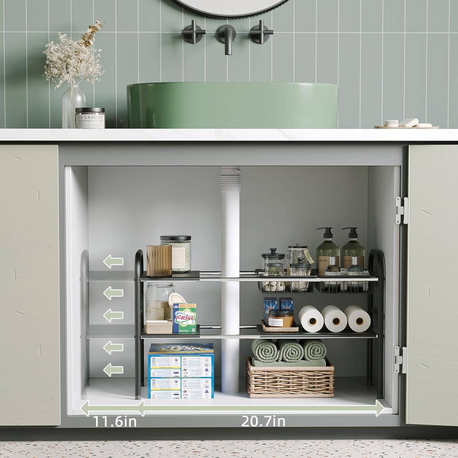 - Expandable and Adjustable Shelf: This model adjusts from 20.7 to 32.3 inches in length, fitting various cabinet sizes and allowing flexibility around pipes using an adjustable shelf system.