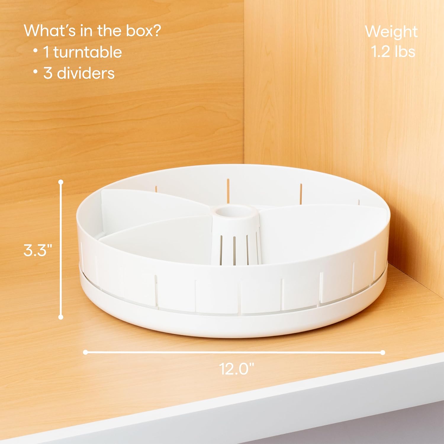 Setup is a breeze—just place the turntable, slot in the plastic organizer dividers, and load it with your kitchen essentials. According to YouCopia, the wide diameter and tall sides bring even the deepest parts of your cabinet organizer within reach. Its minimalist, white design blends with almost any décor, keeping your kitchen storage neat and clutter-free.