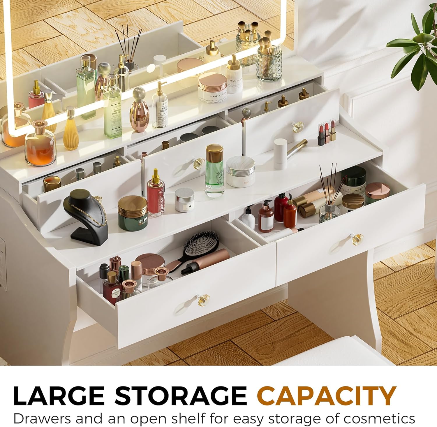 - LED Mirror with Dimmable Lighting: The included mirror features surround lighting with three color options and stepless dimming—perfect for a white vanity table in any light setting.